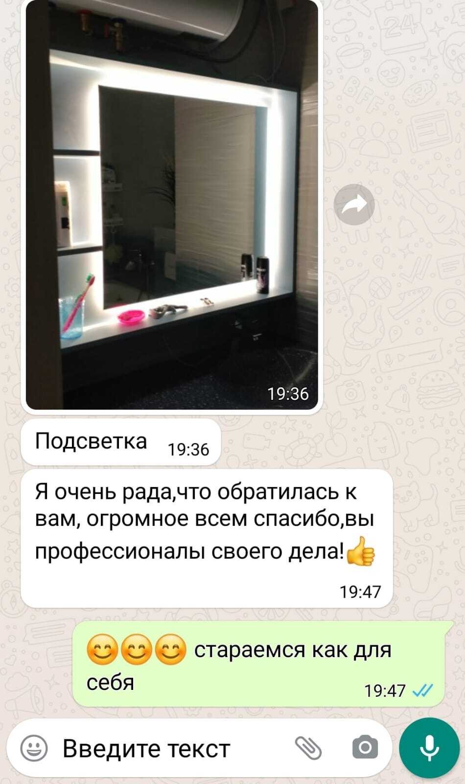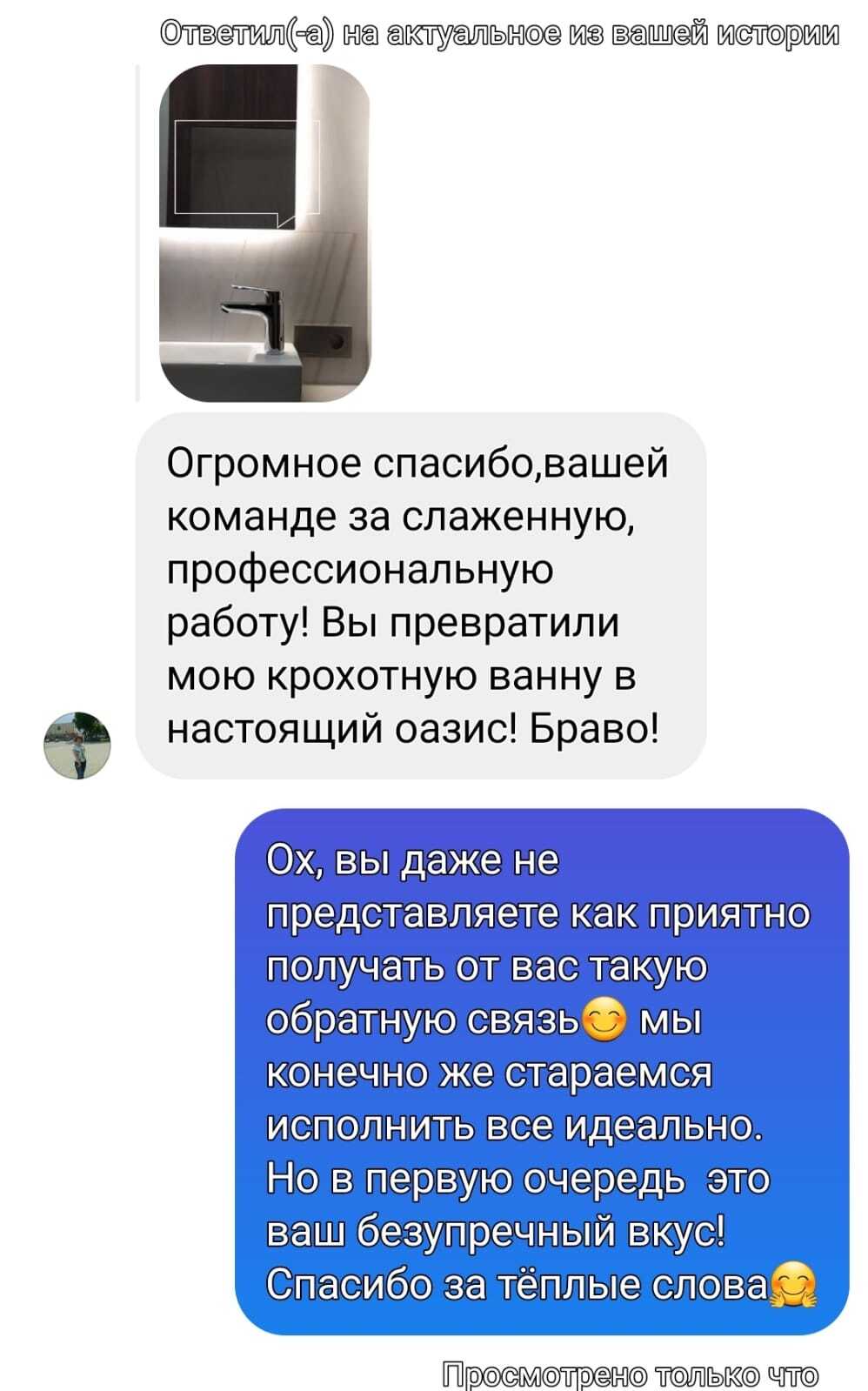 «Огромное спасибо вашей команде за слаженную, профессиональную работу! Вы превратили мою крохотную ванну в настоящий оазис, браво!»