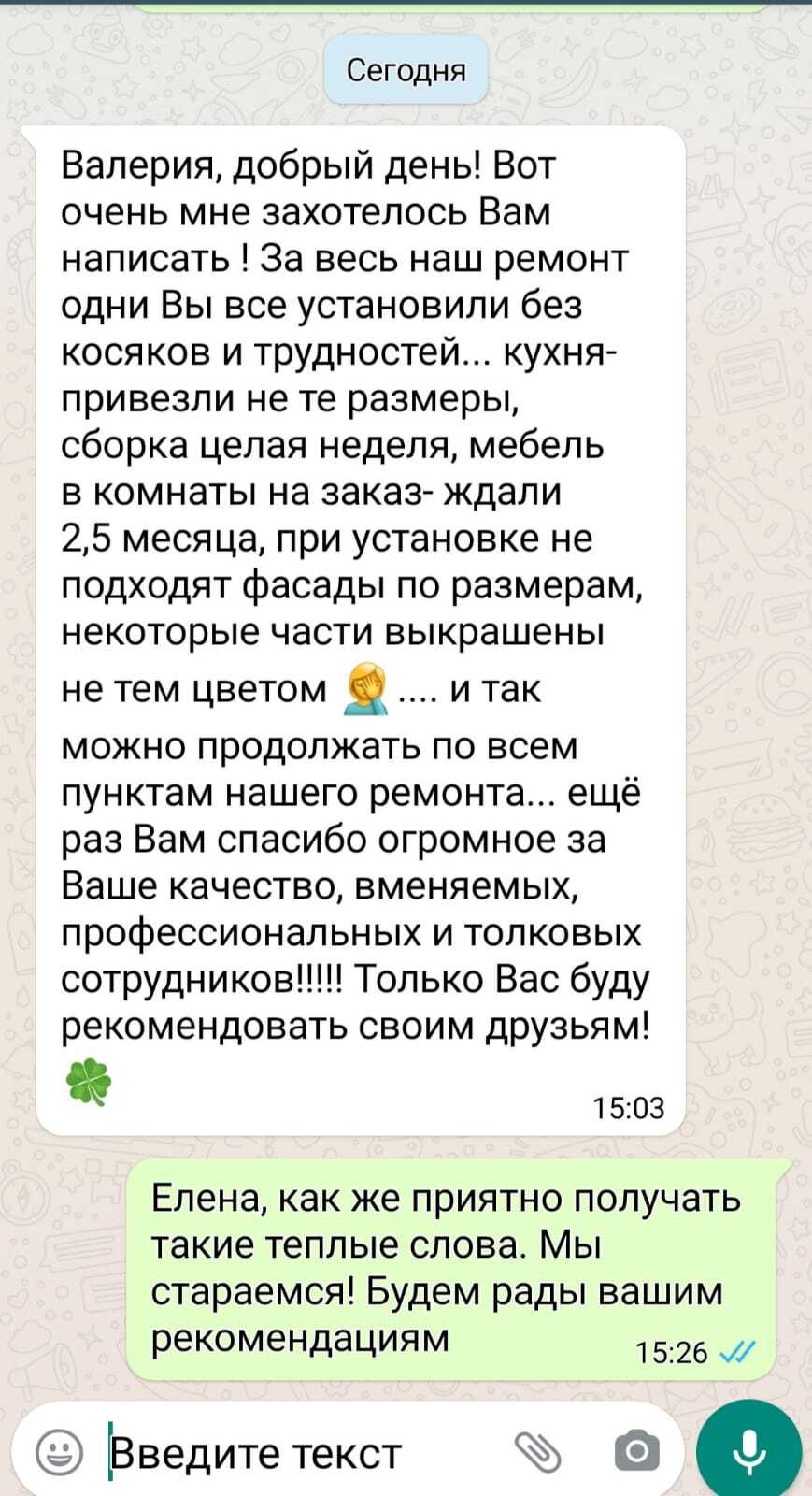 «Вот очень мне захотелось вам написать! За весь ремонт одни Вы все установили без косяков и трудностей! Еще раз Вам спасибо огромное за ваше качество, вменяемых, профессиональных и и толковых сотрудников!!! Только Вас буду рекомендовать своим друзьям.»